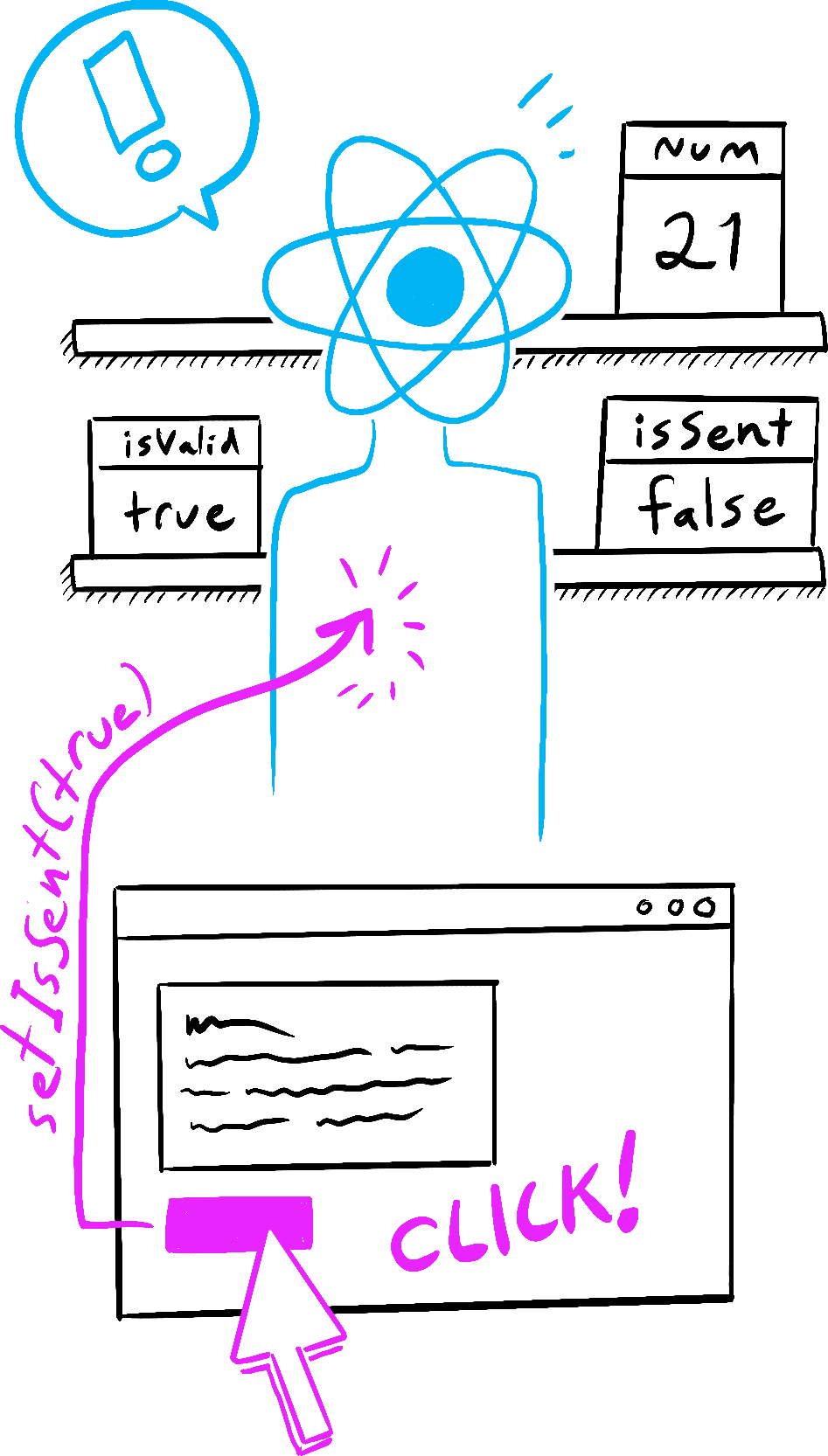 onSubmit. setIsSent(true)assegnaisSentatruee mette in coda un nuovo render.- React re-renderizza il componente in base al nuovo valore di